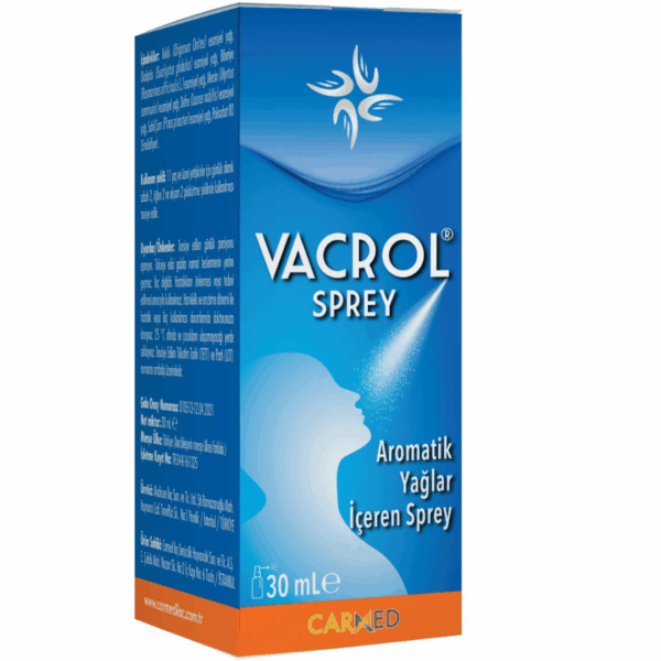 Bilgi : Vacrol Sprey, bitkisel özlü formülüyle Kekik (yüzde 90 standardize karvakrol), Okaliptüs, Biberiye, Mersin, Defne ve Sahil çam esansiyel yağlarından oluşmaktadır. Aromaterapik yağ içeriği günlük temizleyici ve koruyucu ağız bakımı için katkı sağlayabilir. Vacrol Sprey, kaliteli ve etkili doğal aromaterapi yağları içerir, taşıması ve uygulaması kolaydır. İleri teknoloji kullanarak koruyucu ve katkı maddesi bulundurmadan iyi üretim koşulları (GMP) altında üretilmiştir.